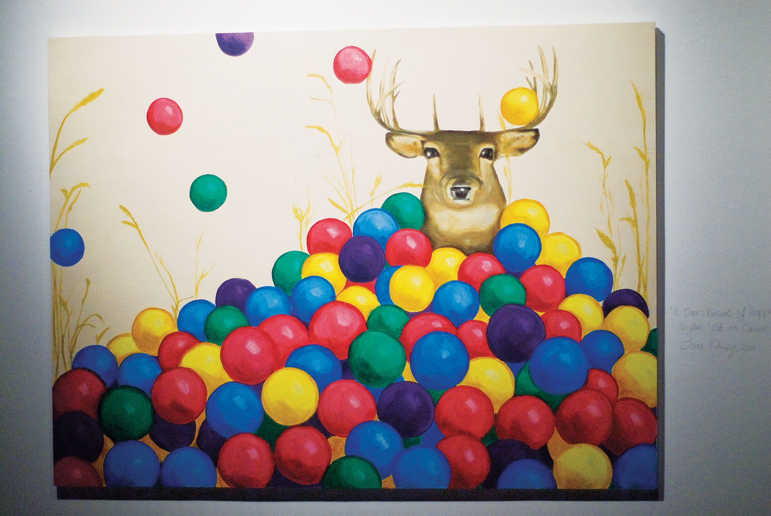 Dorey’s work, though perhaps more playful and light-hearted in tone, poses questions that are no less complex. Her painting, A Deer’s Pursuit of Happiness, features the emotionless bust of a deer peering at viewers from a pile of brightly coloured plastic balls. The juxtaposition of a nature with a highly synthetic environment inverts the viewer’s expectations, creating an image that is as fantastical as it is beautifully executed. “Instead of having our child play outside, we put them in a ball pit, which is actually a really weird thing to do,” explained Dorey.