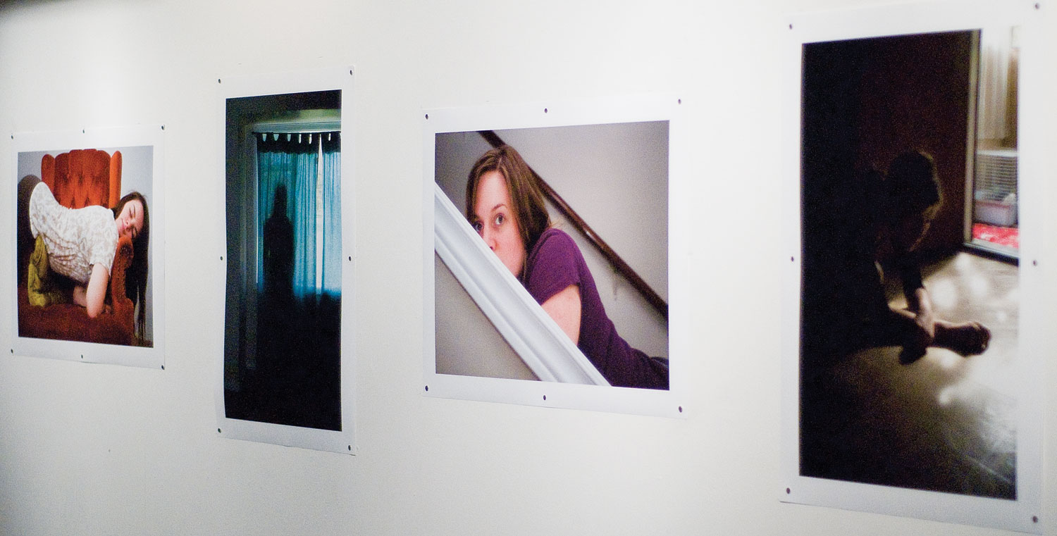 A floral patterned couch, a vase of fake carnations, Danielle Steele’s latest release lying on a coffee table: this campy pseudo-installation of a stuffy living room set occupies the center of the Eleanor Winters Art Gallery.