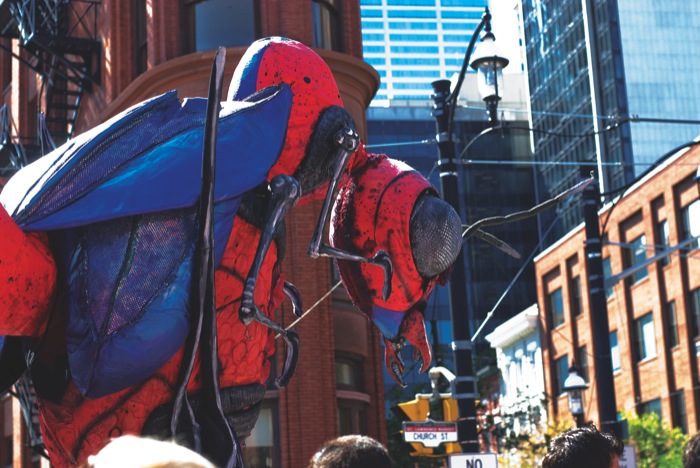 Children crying, teens pointing and laughing, and adults snapping their digital SLRs at the whole scene. The XL Insects, a roaming performance act originating in the Netherlands with the Close Acts theater company, swarmed the streets in front of the Flat Iron building, terrorizing and fascinating with their silver bug eyes and their brightly coloured red and blue bodies. They screeched and dipped their menacing pincers into the sea of people who were just trying to cross the street to use the washroom facilities. Think Cloverfield — but substitute pesky flies in place of gigantic spiders.