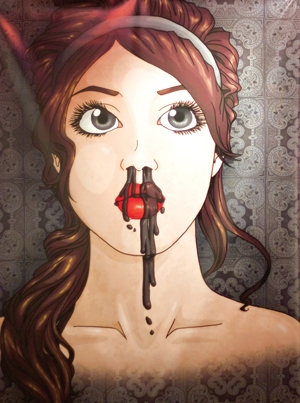Walking past the gallery through the CFA as part of my regular commute, I was stopped dead in my tracks by this animated girl with soulful eyes and a dark substance oozing from her nose. Beside the image, there was a large-scale laminated cloth reading, “Her attraction was fatal.” Many people who enter the gallery remark on experiences of being drawn in by this girl. Rebecca Morton’s series Goo Girls presents works that capture raw emotion in a grotesque portrayal.