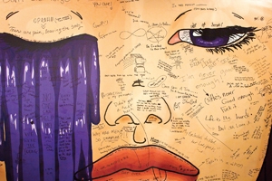 A banner along the southern wall is the basis for an interactive piece where viewers are encouraged to share their stories and succumb to full immersion of the works. Bold black felt markers provide the medium to vent inner turmoil. Morton describes this work as something that “became a therapeutic bathroom stall conversation,” where people will reply to the messages with positive comments of comfort and support.