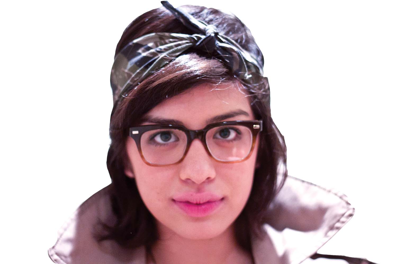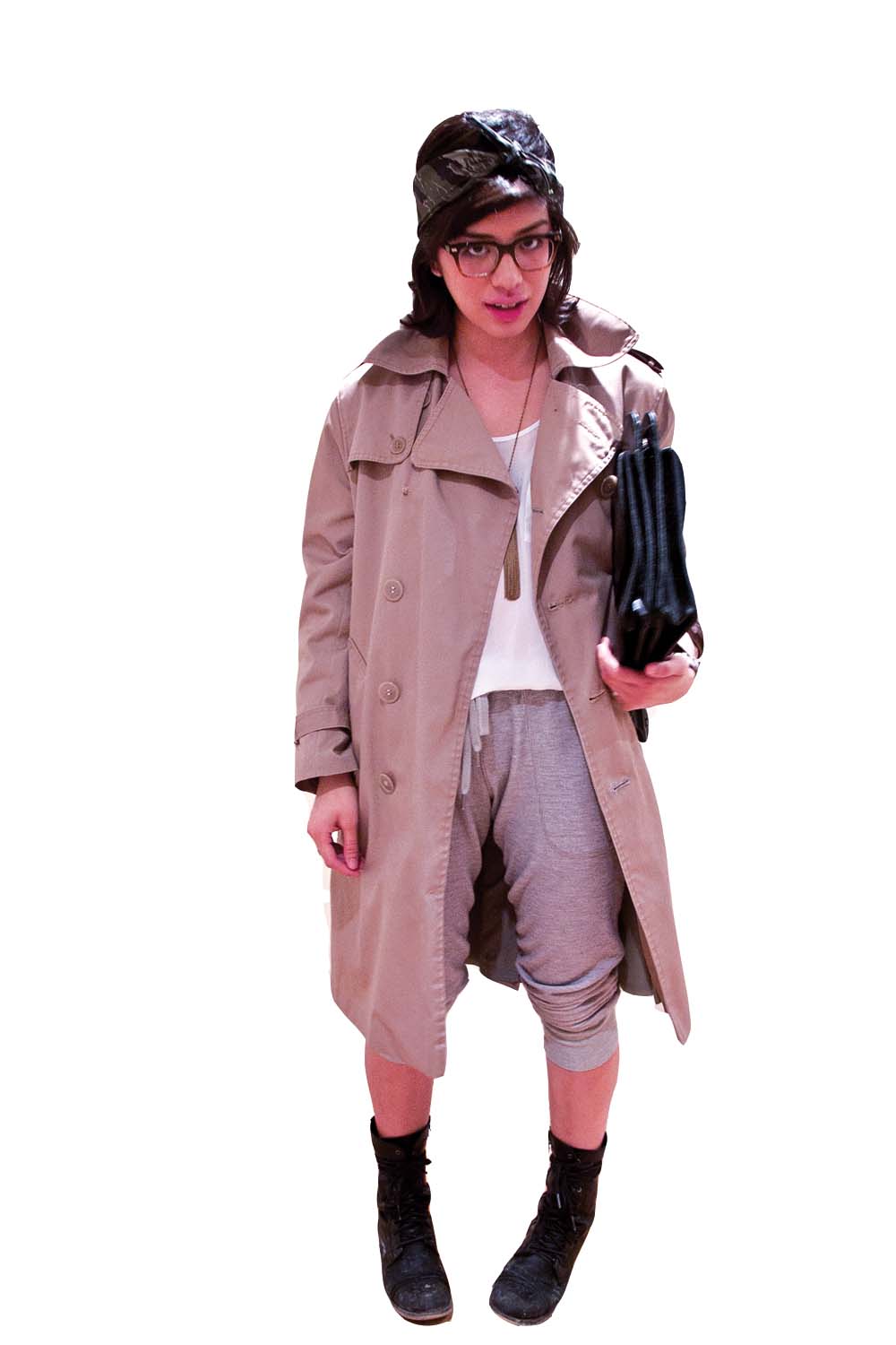 A camouflage bandana wrapped around the head to form a headband is a creative way of transforming one piece of clothing into another. The combination of a white tank top, a simple piece of jewelry and grey sweatpants says simple and casual. A camel trench coat with button-through shoulder tabs thrown over the whole ensemble makes a very comfortable look also a stylish look at the same time. A black leather briefcase in place of a purse adds more edge.