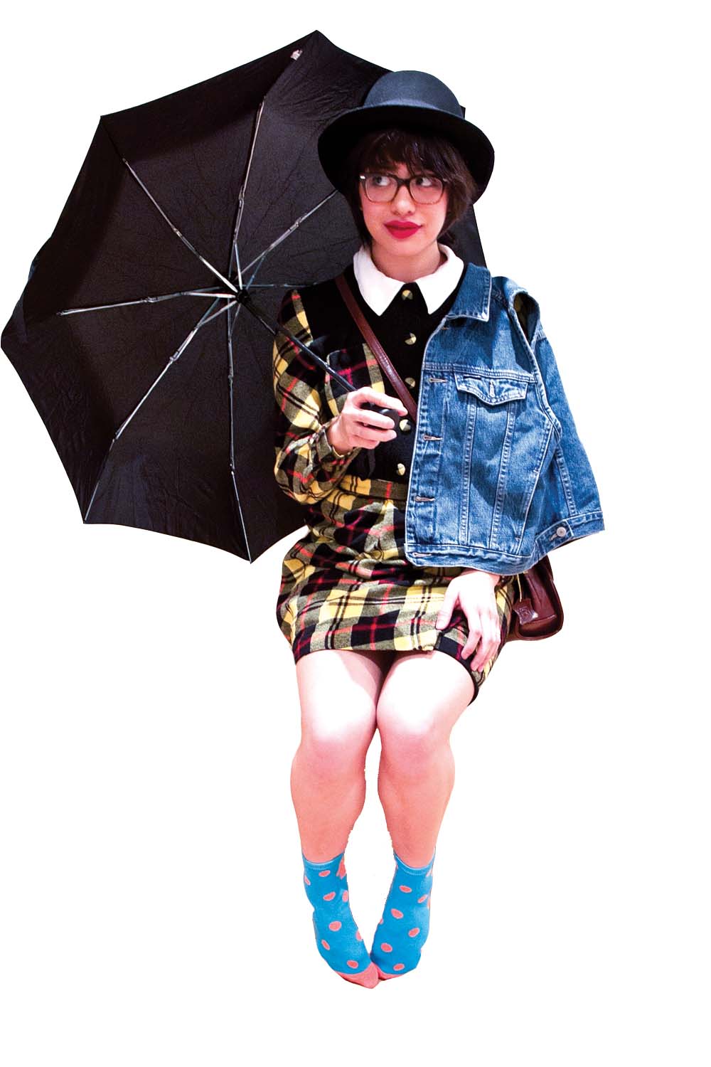 It’s easy to throw on a dress and call the look more feminine, but the combination of accessories is what really does it. The brown leather satchel, bright yellow rain boots, and the black umbrella, brings out the “little girl” that loves playing dress up. The added red lipstick helps make the look more mature, but not too strong. The wool-cotton dress and bowler hat combination alone is already very stylish and strong. The jean vest however, incorporates a more casual tone to the whole ensemble without adding too much.