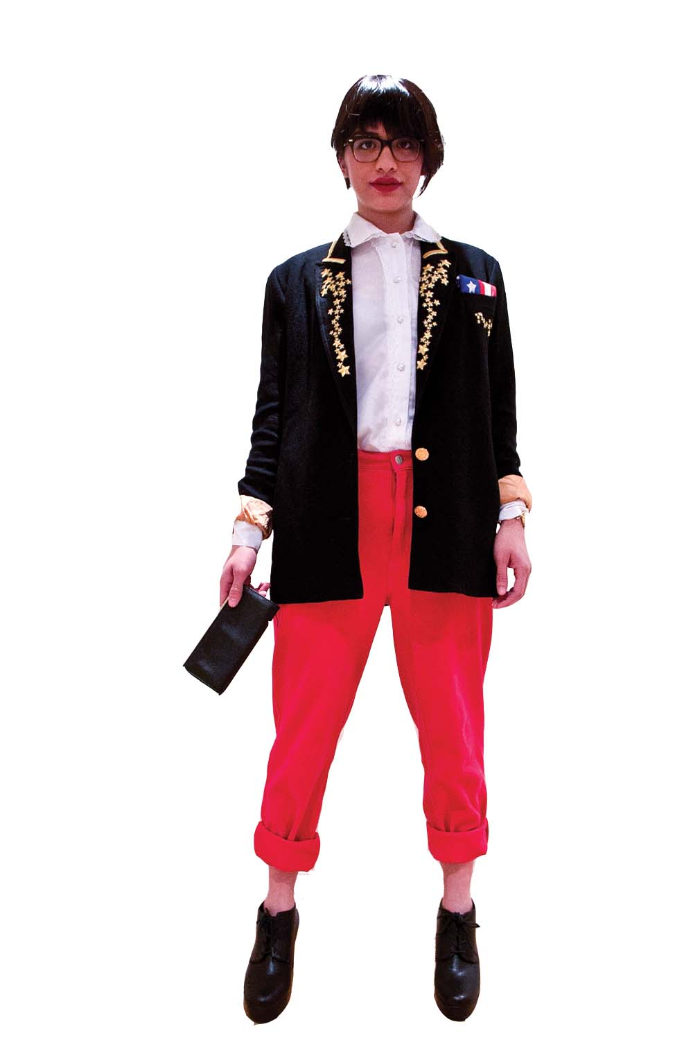 More on the festive side, this black blazer with gold detailing on top of a white silk button up shirt brings out style with a punch. For any women who don’t play around with colour, little details can make a huge difference and make things more exciting. However, this look uses colour to make it more of a dress-up ensemble, not to mention the red lips. The silk scarf used as a pocket square and the black leather clutch definitely say someone is ready for a great night out.
