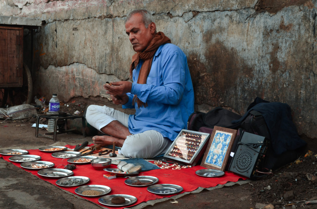 A gemcutter polishes a ring at his gemstones shop on the side of the road, near the food market.