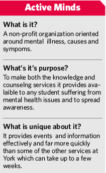 Lindsay Rubinfeld and Aranda Wingsiongi are here to help. They are the co-founders of the York chapter of the student mental help group Active Minds. Active Minds is a non-profit organization founded in 2001. With 351 chapters across the US and Canada, Active Minds’ goal is to make both knowledge and the social events available to any students suffering from mental health issues.