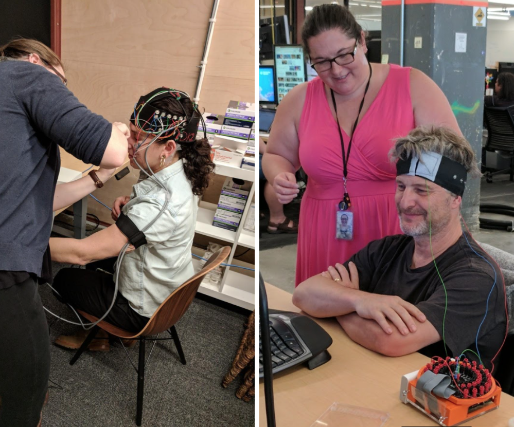 Hardware engineer Gabriella Levine (left), neuroscientist Sarah Laszlo (right) testing early Amber prototypes. (Courtesy of Alphabet Archives)