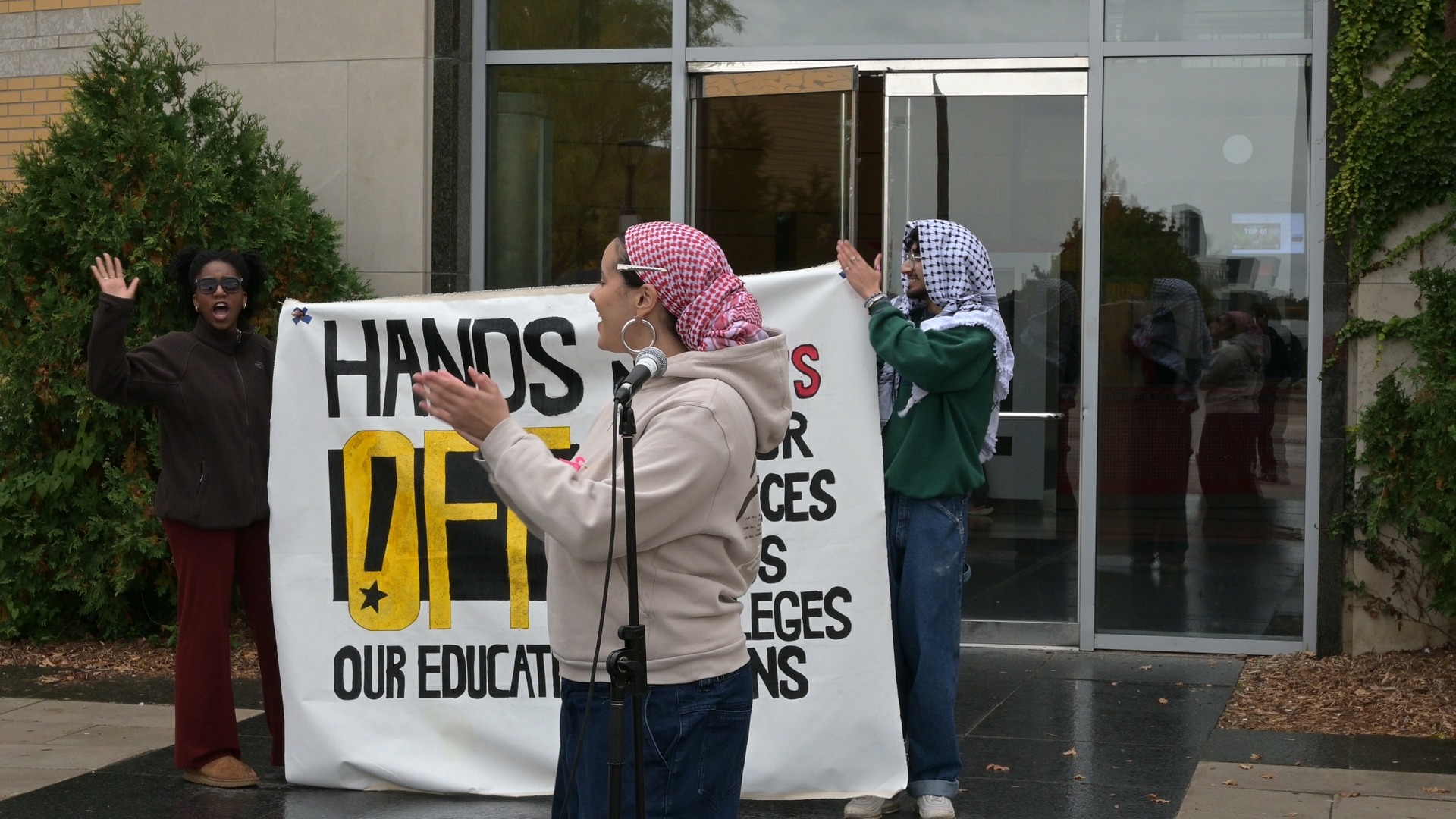 This chant, authored by YFS President Somar Abuaziza, was one among many voiced by a small but impassioned crowd of students, staff, and faculty standing just outside of Vari Hall.