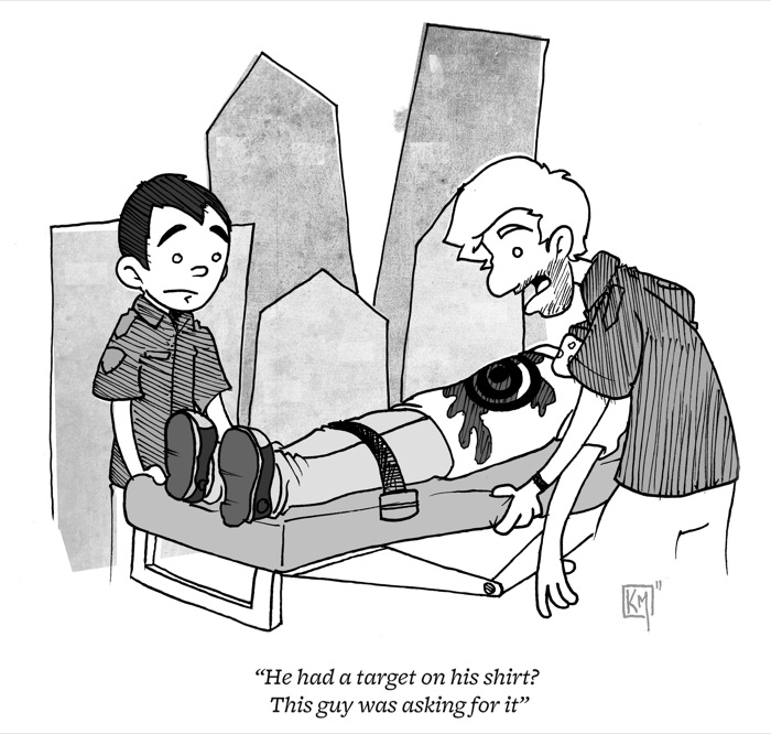 If wearing a low-cut top is asking for it, by the same logic, wearing a bull’s eye T-shirt puts you partially at blame if somebody decides to shoot you. The idea of someone as a willing participant in the direct violation of their personhood is absurd.
