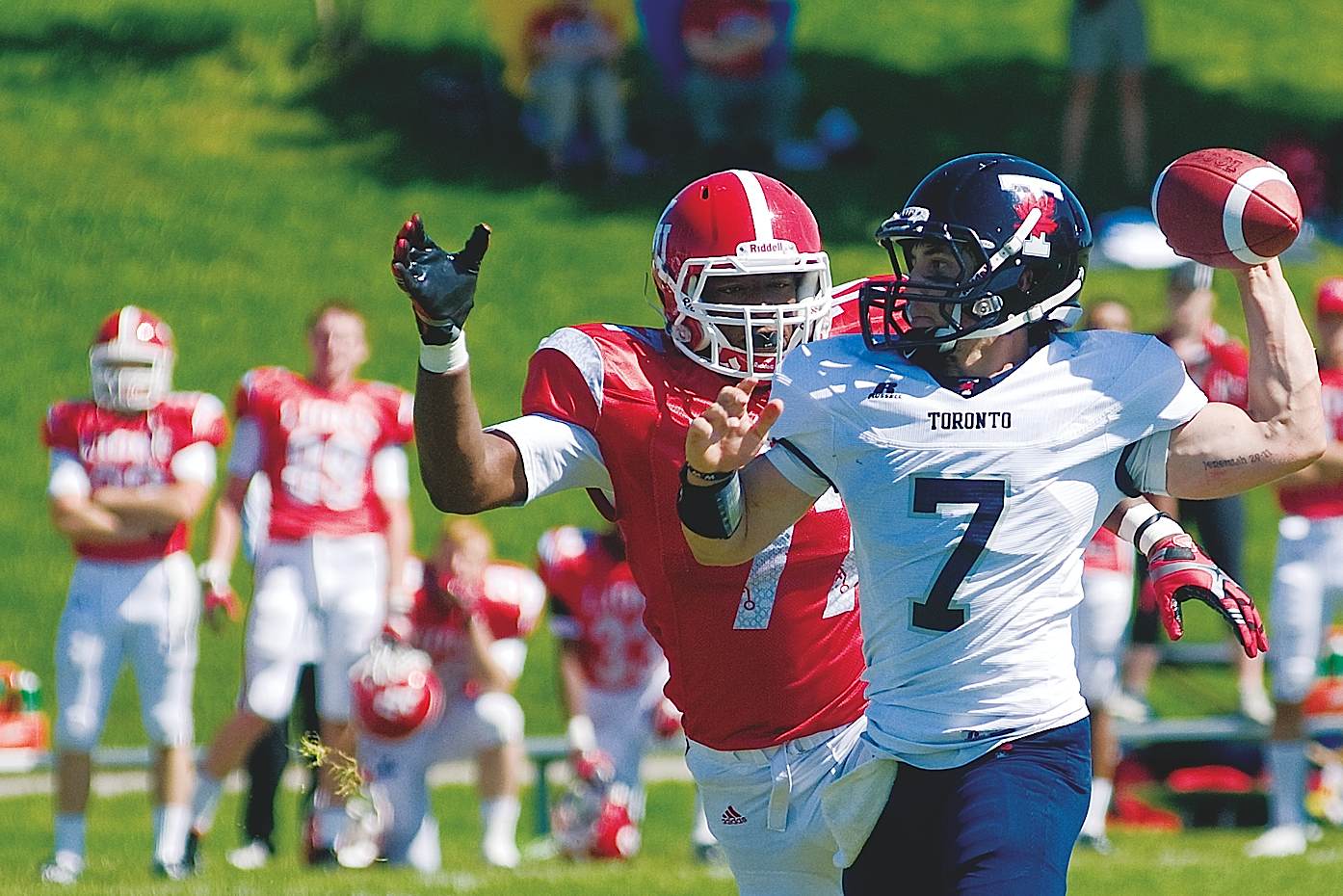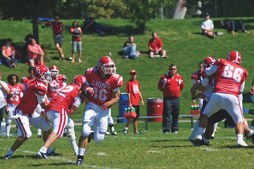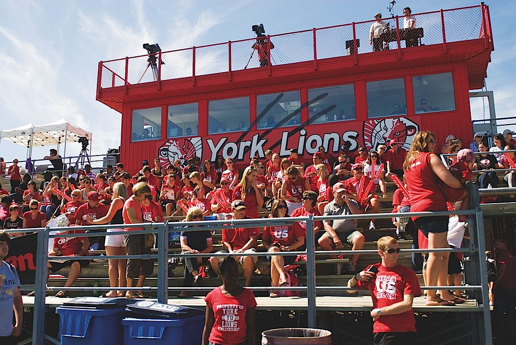 York fans show their undying support at the 42nd annual Red and Blue Bowl. Lions surge forward in an attempt to get a first down and hopefully more. Linebacker Tyler De Moel leads the York players charging out of the locker room. Toronto Varsity Blues celebrate as they hoist the Argo cup for the 4th consecutive year.