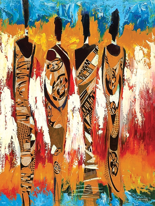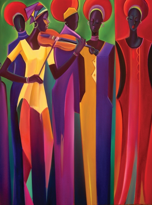 “My work focuses on inner beauty, festivity, and celebration. I work primarily in oil because of its lustre and sensual qualities, creating layers of simple colors, shapes, and exciting movements. I am originally from Nigeria, but have embraced various cultures over the years. All of which have influenced my art,” says Ohiro.