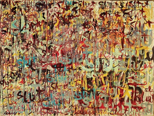 There are so many ads depicting women in passive but oversexualized situations, where they choose to submit to aggressive macho desire. Females call each other sluts like it’s a compliment. We have such a disturbing, messy, and layered relationship with the word, and I’ve tried to portray that through the vigorous repetition of “slut” over the canvas, to the point of illegibility, because it’s not an easily decipherable issue.