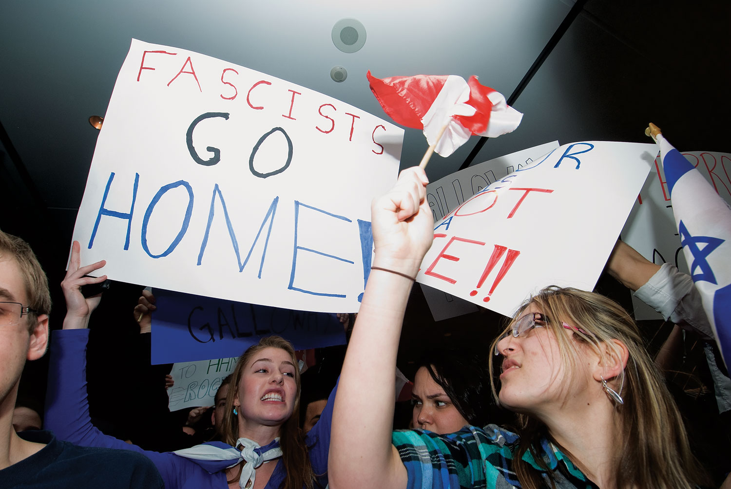 Outside the theatre during the lecture, anti-Galloway protesters equipped with homemade signs that read “from Galloway’s pockets to Hamas rockets” and “Darfur is not a lie,” chanted “peace, not hate” and “not on our campus, not on our dime.”