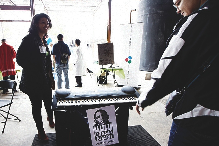 Ashley Lewis, a third-year student at Ryerson, displayed her “Obama Board,” a reprogrammed electric keyboard. Instead of musical notes, each key was remapped to produce Barack Obama’s voice; pressing different keys produced different words from his inauguration speech.