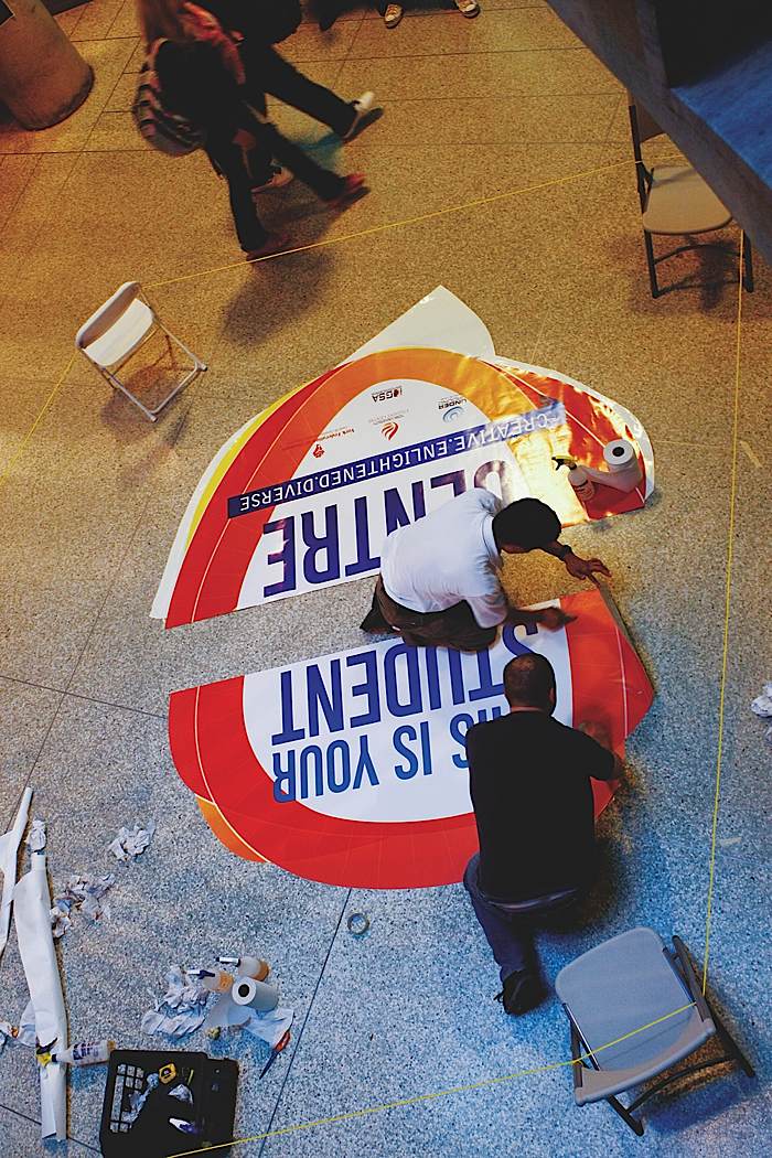 Staff glue down the newly revamped Student Centre logo by the spiral staircase of the York University Student Centre (YUSC) building where the Goddess of Democracy statue once stood. The burning flame logo represents “Creative, Enlightened, Diverse” and takes the place of the old logo featuring a symbol of the Goddess Statue.