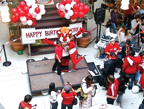 spotted on campus • On Red and White day, York’s golden-maned mascot was giving out free hugs and posing for photos in the middle of the Student Centre to celebrate the school’s 53rd birthday. A bevy of athletic achievements were also celebrated, with cheerleaders, live music, and a DJ. Faculty, staff, and students clad in red-and-white gear had a chance to win prizes, and the bookstore sold discounted merchandise in honour of the event. There was plenty of clapping, cheering, and of course, mounds of free cake. Congratulations, York: you’re middle-aged.
